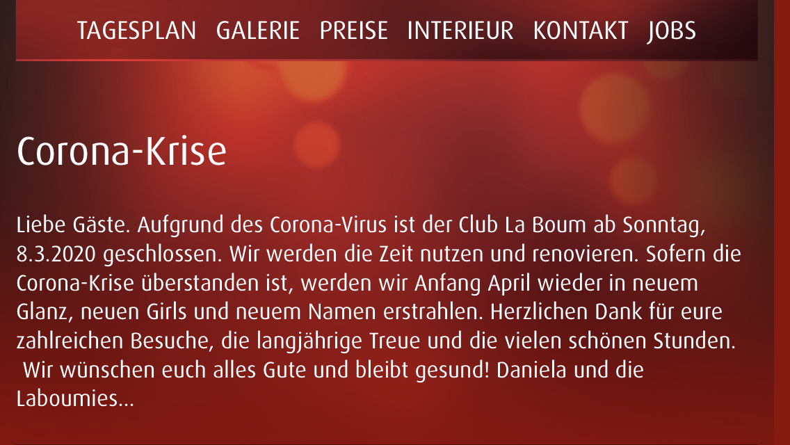 Liebe Gäste. Aufgrund des Corona-Virus ist der Club La Boum ab Sonntag, 8.3.2020 geschlossen. Wir werden die Zeit nutzen und renovieren. Sofern die Corona-Krise überstanden ist, werden wir Anfang April wieder in neuem Glanz, neuen Girls und neuem Namen erstrahlen. Herzlichen Dank für eure zahlreichen Besuche, die langjährige Treue und die vielen schönen Stunden. Wir wünschen euch alles Gute und bleibt gesund! Daniela und die Laboumies...