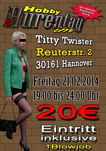 Am Freitag, den 21.02.2014 veranstalten wir in der Zeit von 19.00 Uhr bis 24.00 Uhr unseren 2. Hobbyhuren Tag im Titty Twister in Hannover. Nachdem unser erster Hobbyhuren Tag eine so große Resonanz erfuhr, werden wir den Hobbyhuren Tag jetzt regelmäßig veranstalten. Gerne dürfen sich Frauen oder Paare bei uns melden, wo SIE, in einem sicheren Umfeld, einmal als Hure arbeiten möchte um so ihre Neigungen ausleben zu können und um sich ein kleines Taschengeld dazuzuverdienen. Ausführliche Informationen und die Spielregeln findest du auf unserer Webseite.