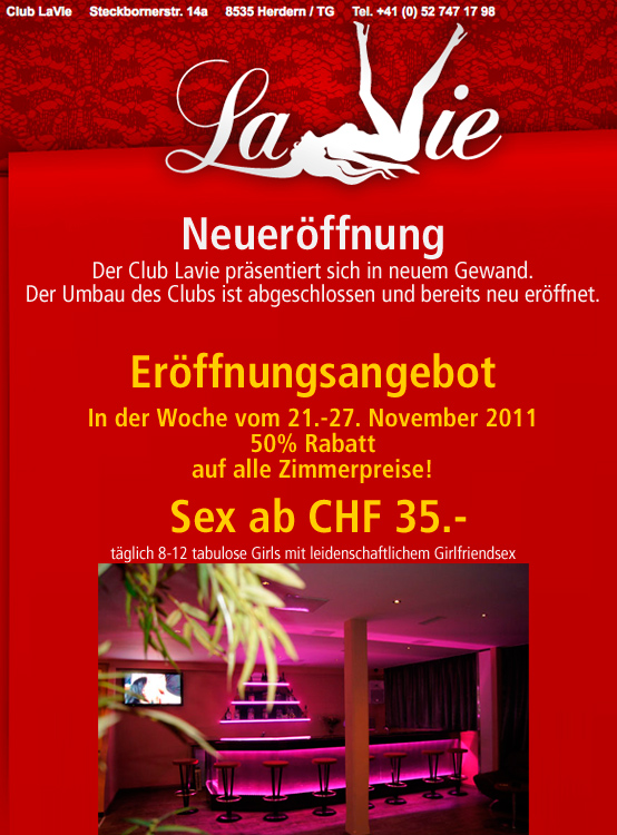 Habe die Sexparty im Club Lavie Herdern nun ausprobiert. Wenn du vorallem Druck ablassen willst oder mehrere Frauen "testen" willst, ist die Party ein preiswertes Angebot. Wenn du echte Unterhaltung suchst, wirst du eher enttäuscht sein. Der Club ist einfach nicht mehr wie früher, als ich hier immer wieder tolle Nachmittage und Abende hatte. Schade.