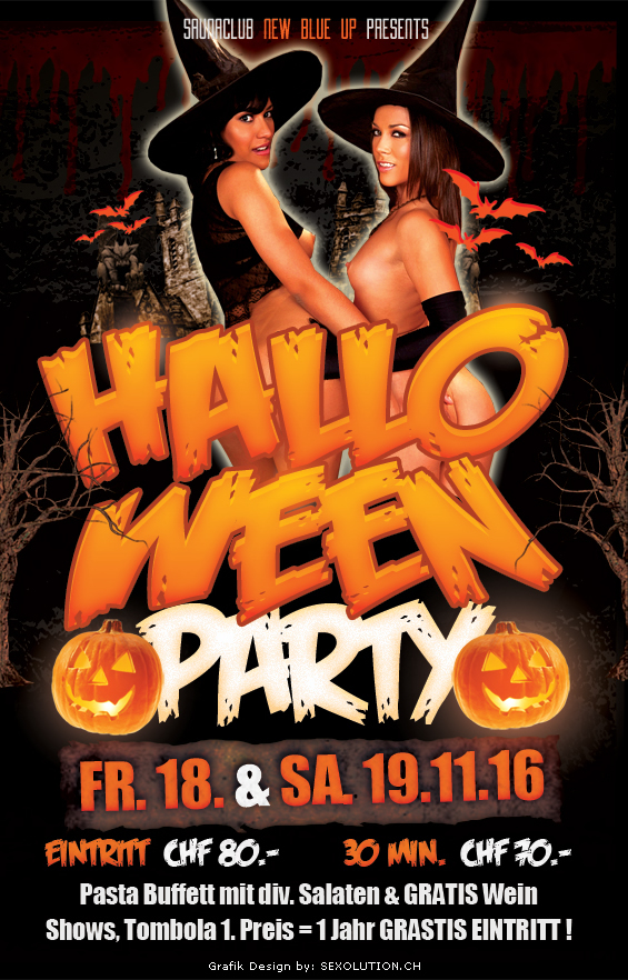 Bereits um 17:00 recht viele Blaubären im Club und eine Bärin, die solche Parties liebt. War schon an Halloween 2014 mit dabei. Um 19:00 gab es eine erste Lesbo-Show mit Teo und Alexia. Die beiden Lesbo-Hexen holten ein Opfer vom Sofa aufs Rondell, wo es verführt wurde. Ganz ansprechende 3er Performance. Darbietungen dieser Art gab es im Verlauf des Abends mehrfach.