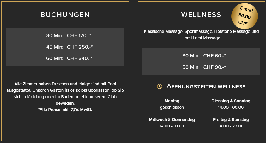 Schöner Club über zwei Etagen, wobei die Zweite getrost vernachlässigt werden, da es dort kaum Girls gibt, sonderen nur die Sauna und die Solarbacköfen. Der Bär steppt im EG und auf der 1. Etage. Im EG finden wir auch die Bar und Sofas. Hier wird gejagt und angebandelt. Im 1. Stock hat es ein sauberes Pronokino, Zigarren-Lounge und nochmals schöne Sofas mit direktem Blick auf die Bar im EG. Alle Zimmer sehr sauber.