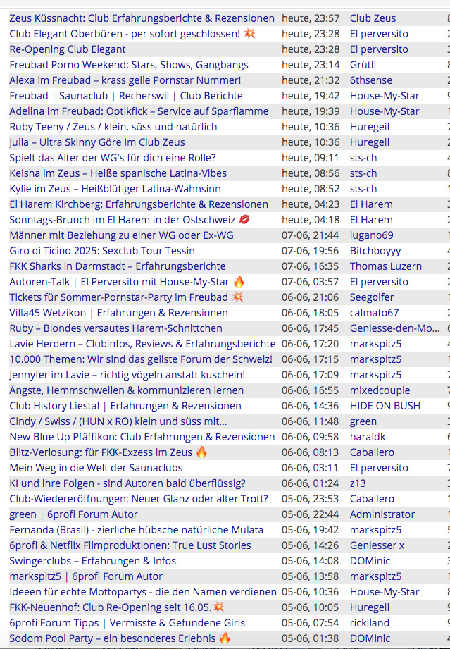 6profi ist das offizielle Sexforum der Schweiz, in dem Argumente, Erfahrungen und Meinungen zählen – nicht Ego-Spielchen. Lasst uns also respektvoll miteinander umgehen, den Fokus auf die Themen legen und die Diskussion produktiv gestalten. So bleibt der Austausch spannend, informativ und fair für alle Beteiligten.