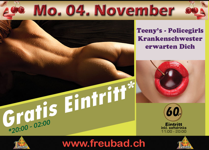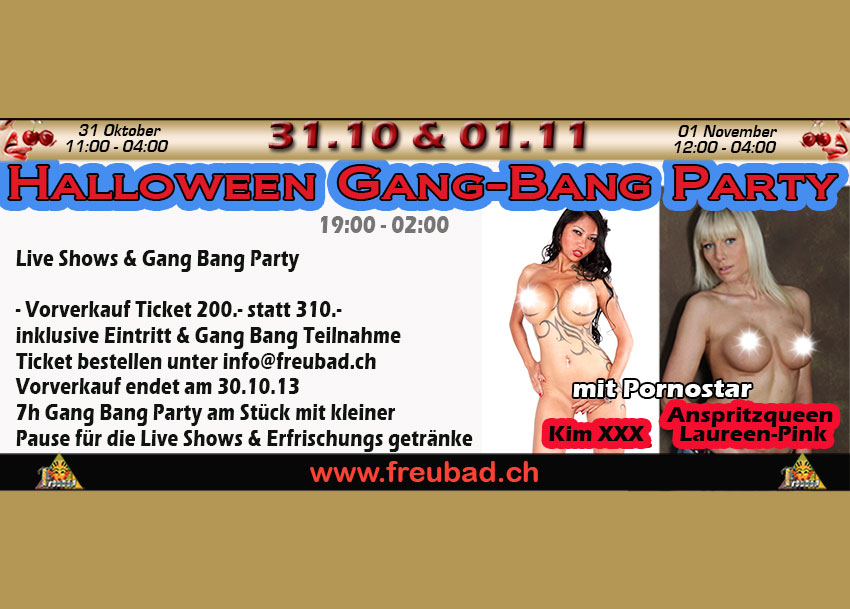 Am Freitag, den 26.04. und Samstag, den 27.04.2013 findet bei uns im Freubad in Recherswil ein Mega Event mit mehreren Live-Shows und mehreren Gang-Bang-Sessions statt. Die Pornostars Laureen Pink und Curly Ann werden Euch mit ihren Live-Shows so richtig einheizen und anschließend bei den Gang-Bang-Sessions hart rannehmen. Unsere Pornostars hautnah erleben, sind zum Anfassen und mitmachen. Es finden am Freitag und am Samstag jeweils drei sexy Live-Shows zum Einheizen und drei megageile Gang-Bang-Partys, insgesamt min. 5 Stunden, statt.