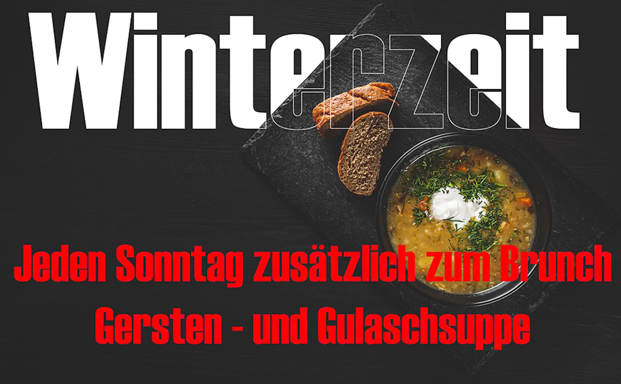 Passend zur kalten Jahreszeit erweitern wir unser reichhaltiges Sonntagsbuffet um köstliche, heiße Suppen. Freut euch auf deftige Klassiker wie Gersten- oder Gulaschsuppe – perfekt, um euch aufzuwärmen!