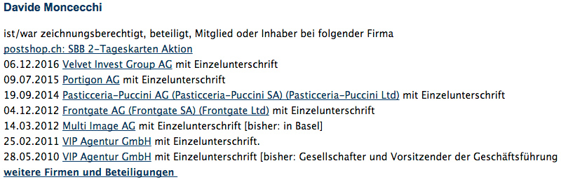Die Pasticceria Puccini AG hat Moncecchi im September 2014 ins Handelsregister eintragen lassen. Verwaltungsratspräsident war Moncecchi auch bei einer früheren Firma mit dem Namen Multi Image AG, die Beratungen im Bereich Medien und Kommunikation anbot. Sie ist mittlerweile liquidiert. Ein Konkursverfahren wurde mangels fehlender Aktiven eingestellt.