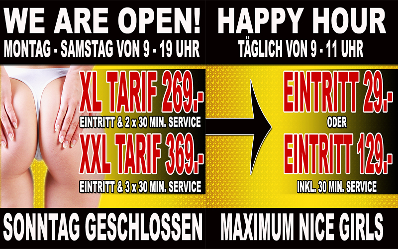 Happy Hour jeden Tag von 11 bis 13 Uhr und ab 01.00 Uhr Nachts. 30 Minuten Vollservice - Eintritt - Essen und Softgetränke für unglaubliche 99.-