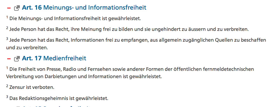 Gemäß Artikel 16 der Bundesverfassung der Schweizerischen Eidgenossenschaft genießen wir hier Meinungs- und Informationsfreiheit, und Zensur ist ausdrücklich untersagt.
